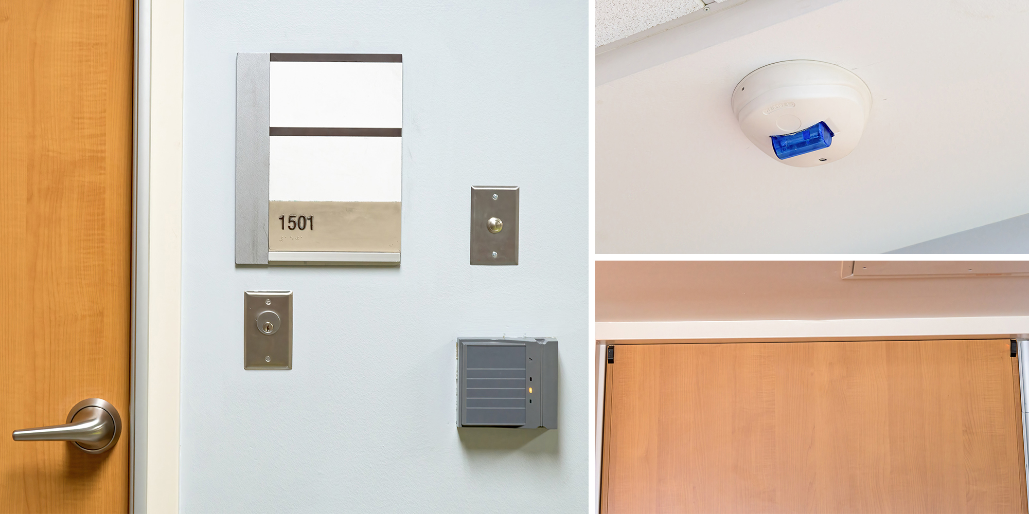 When the beam is interrupted, Top Door Alarm® creates multiple audible and visual alarm notifications to alert staff of a potential act of self-harm including a light at each hallway door site that can flash or stay steadily on, a hallway siren, and a room indicator panel in the nurses’ station with both visual and audible alerts.